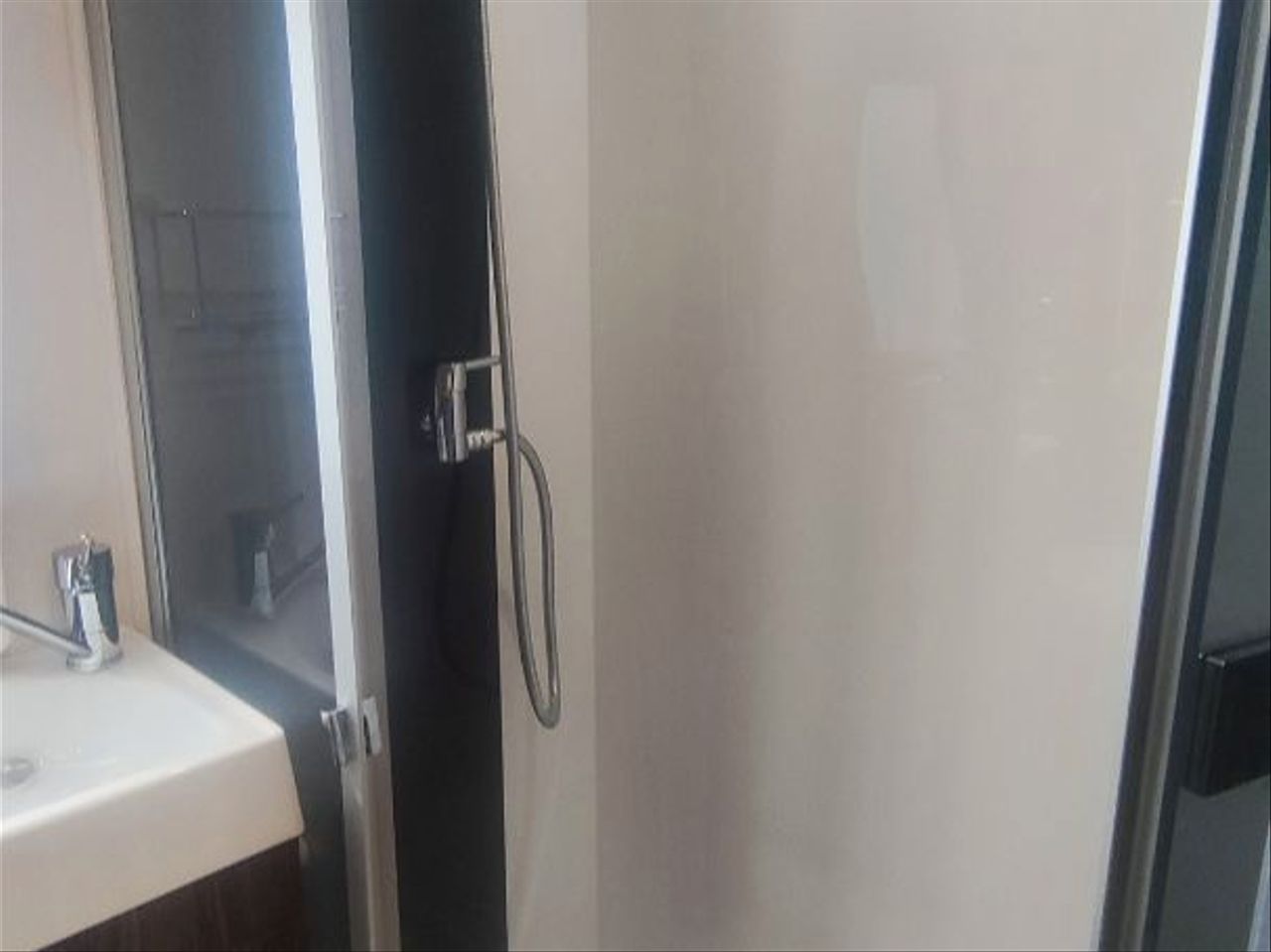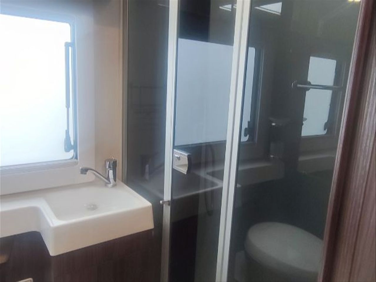 baño interior con wc y labavo y ducha separada por mampara.
