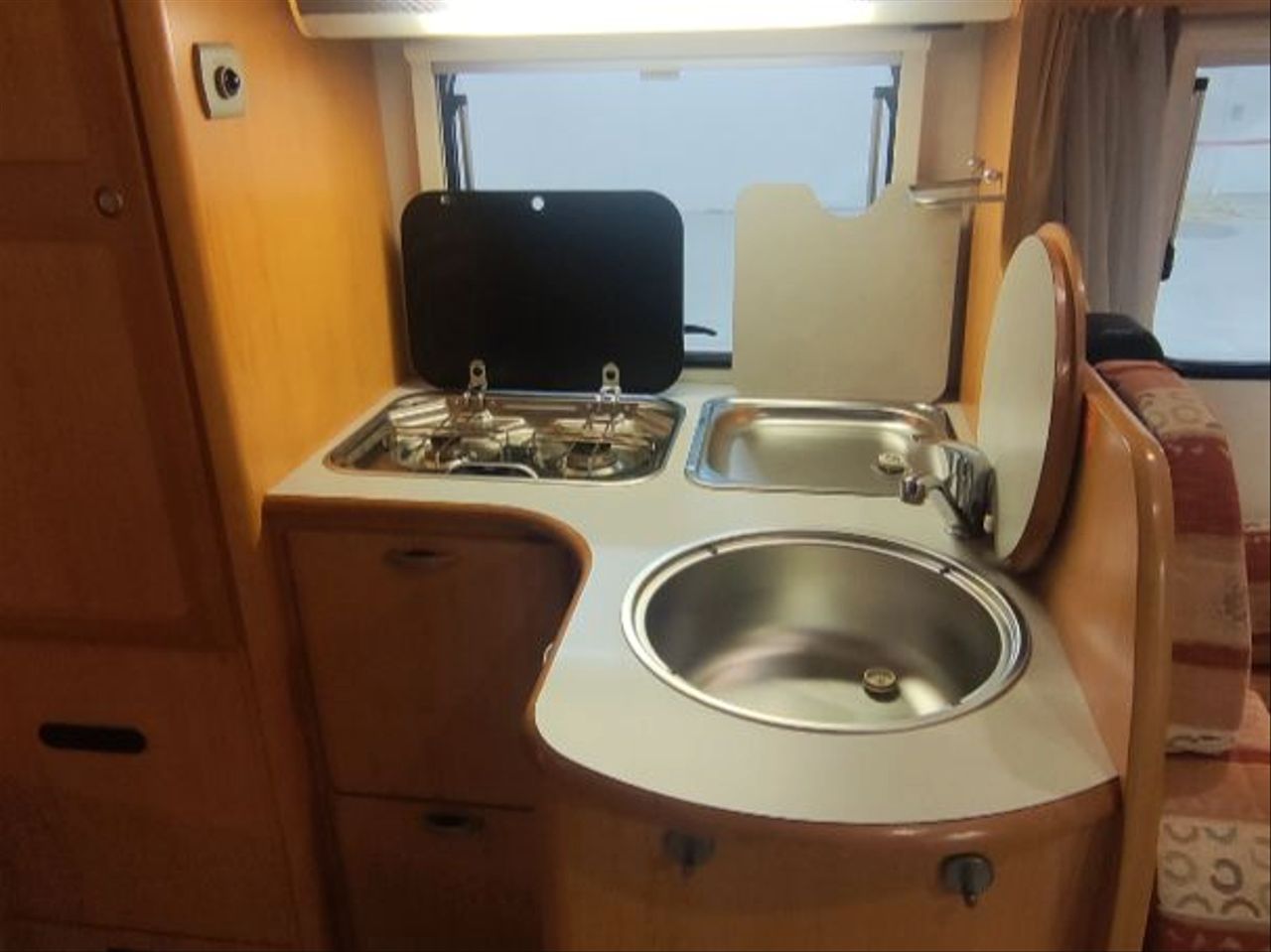* Cocina en L con escurridor con tapa y tapa fregadero, cocina de 2 fuegos y extractor
