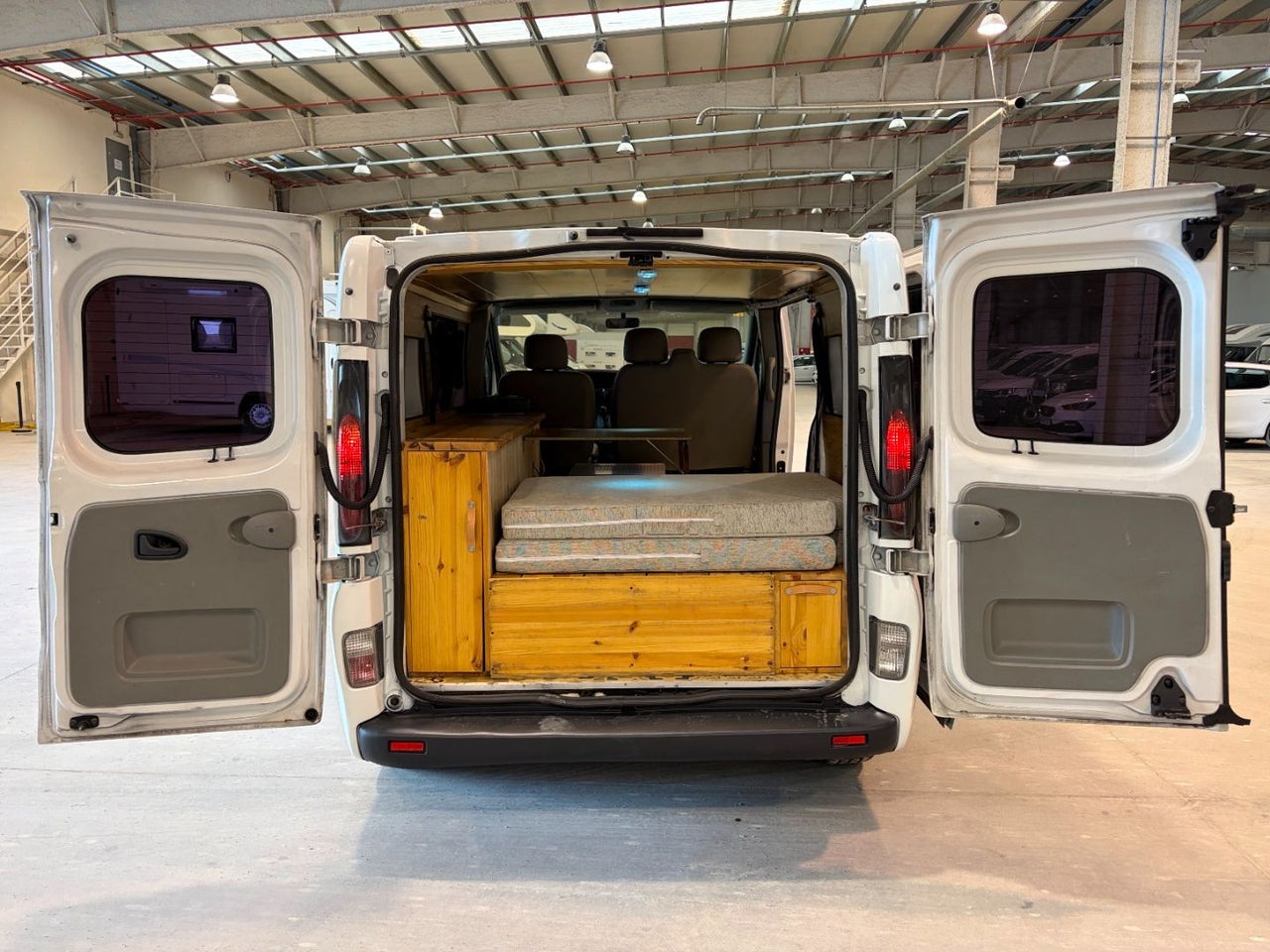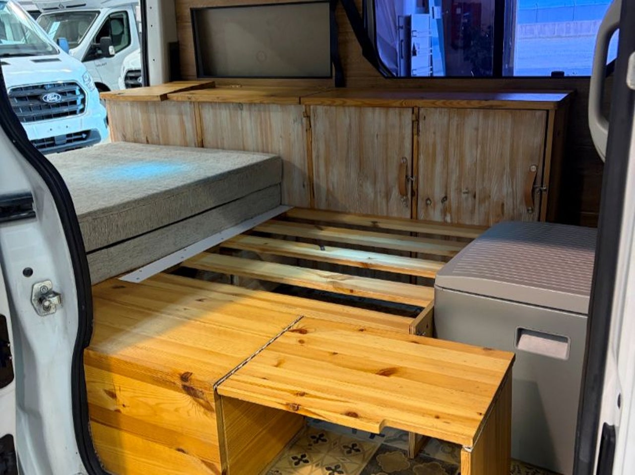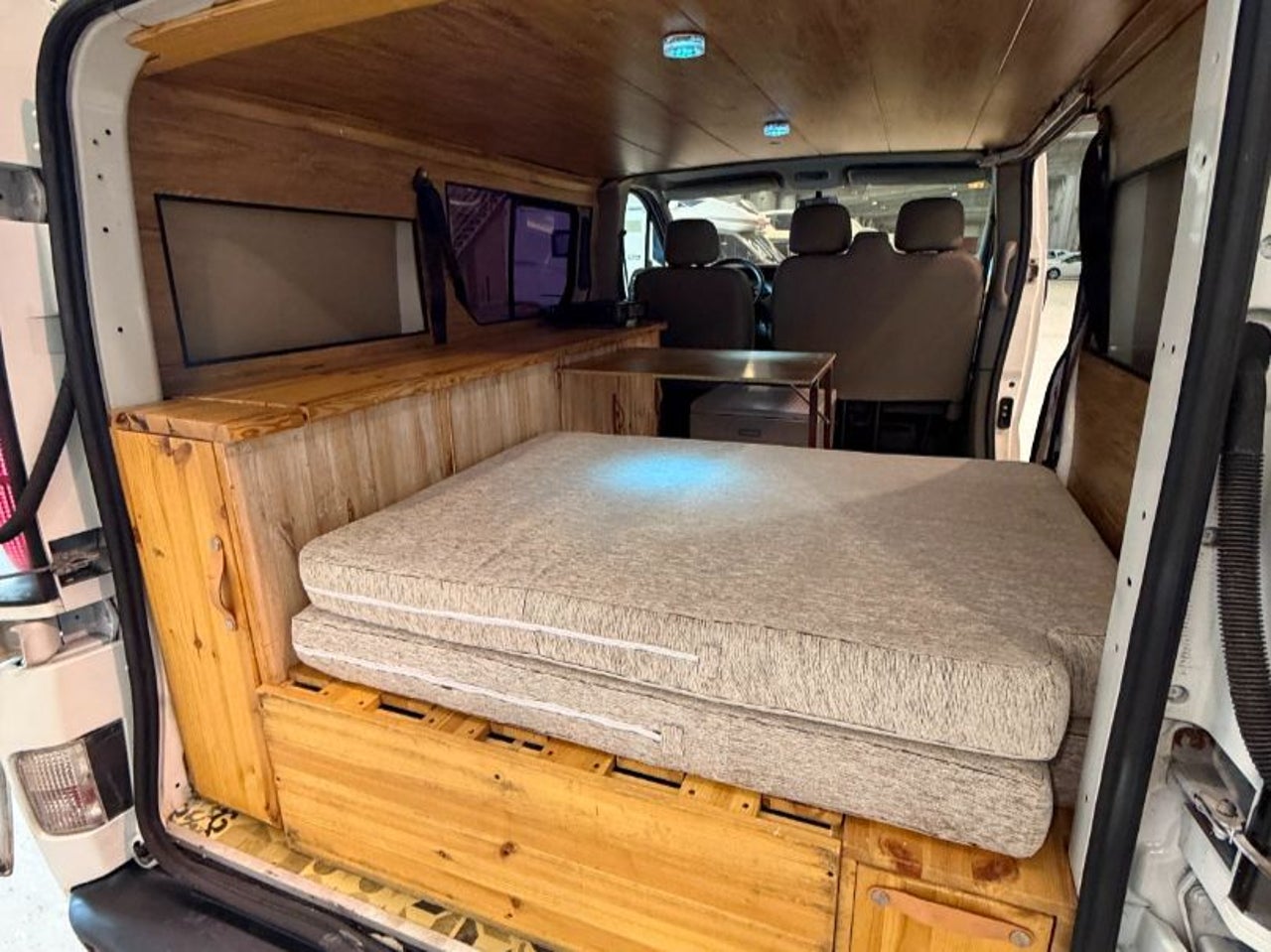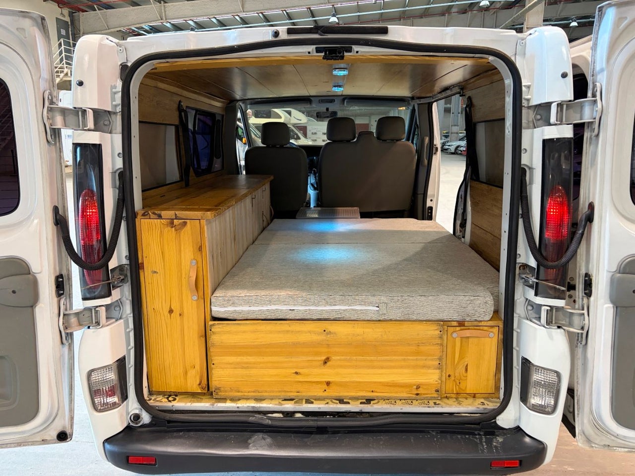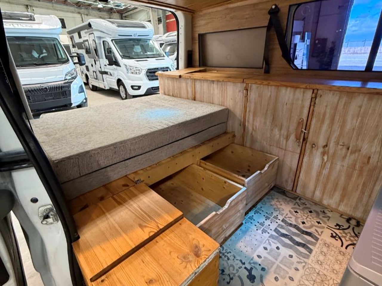 CAMPERIZACION EXTRAIBLE. CONSISTENTE EN MOBILIARIO LATERAL IZQUIERO CON ARMARIOS Y ENCIMERA, CAMA DOBLE PLEGABLE, MESA PARA COMER, GRANDES CAJONES DE ALMACENAJE BAJO LA CAMA.