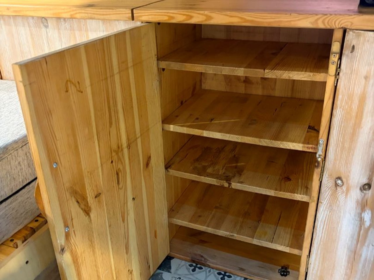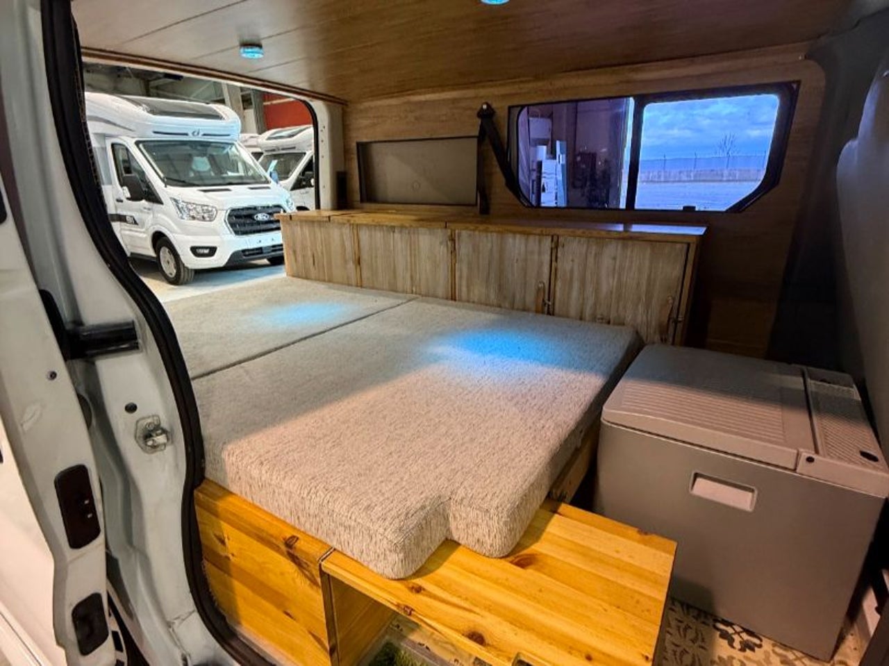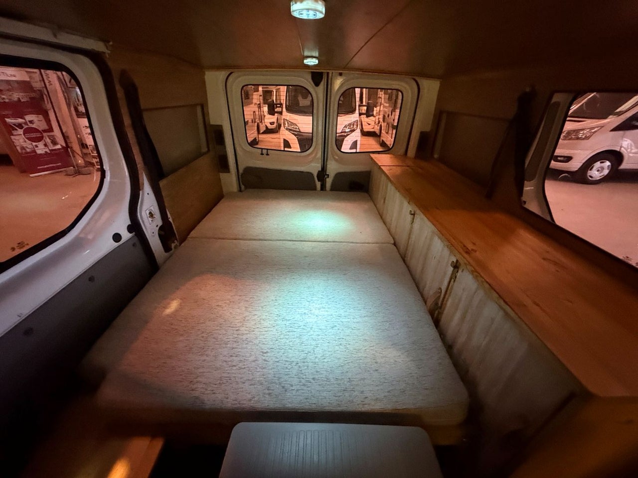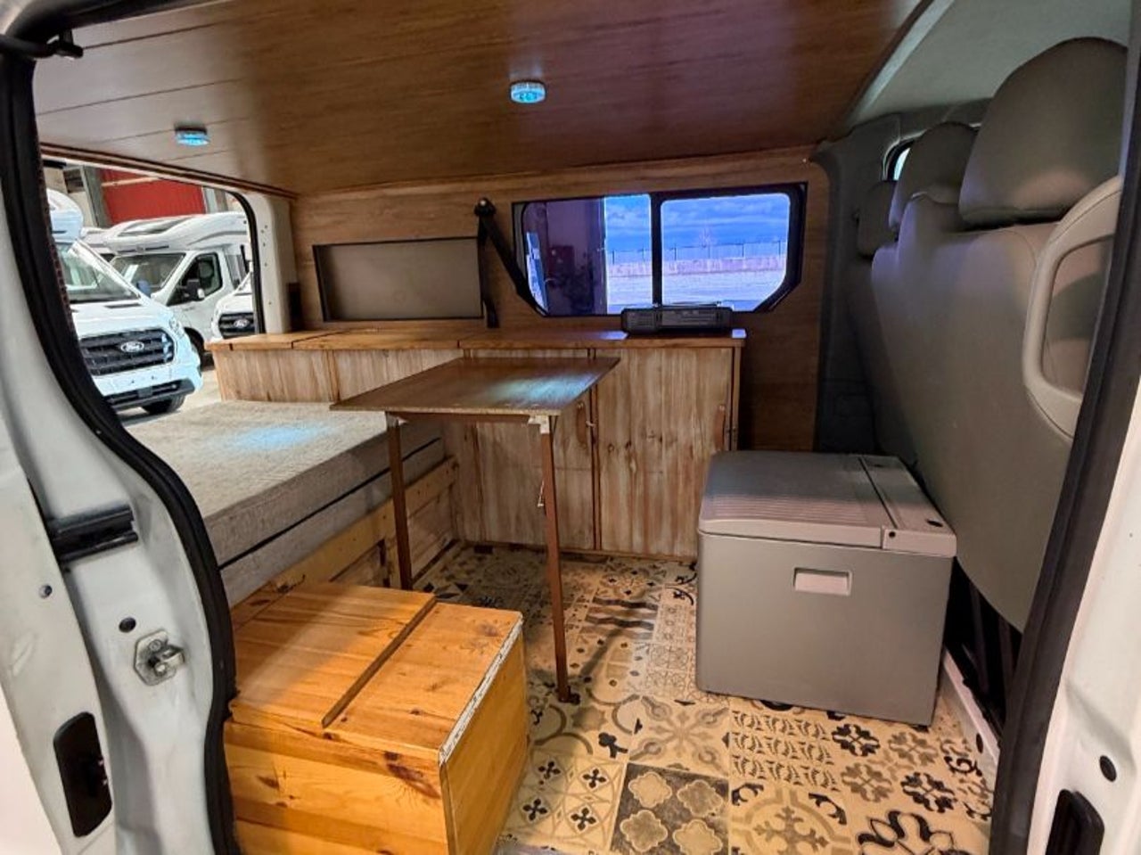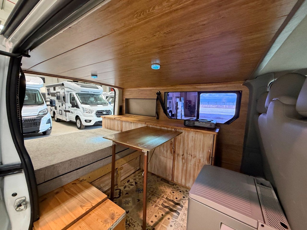 CAMPERIZACION EXTRAIBLE. CONSISTENTE EN MOBILIARIO LATERAL IZQUIERO CON ARMARIOS Y ENCIMERA, CAMA DOBLE PLEGABLE, MESA PARA COMER, GRANDES CAJONES DE ALMACENAJE BAJO LA CAMA.