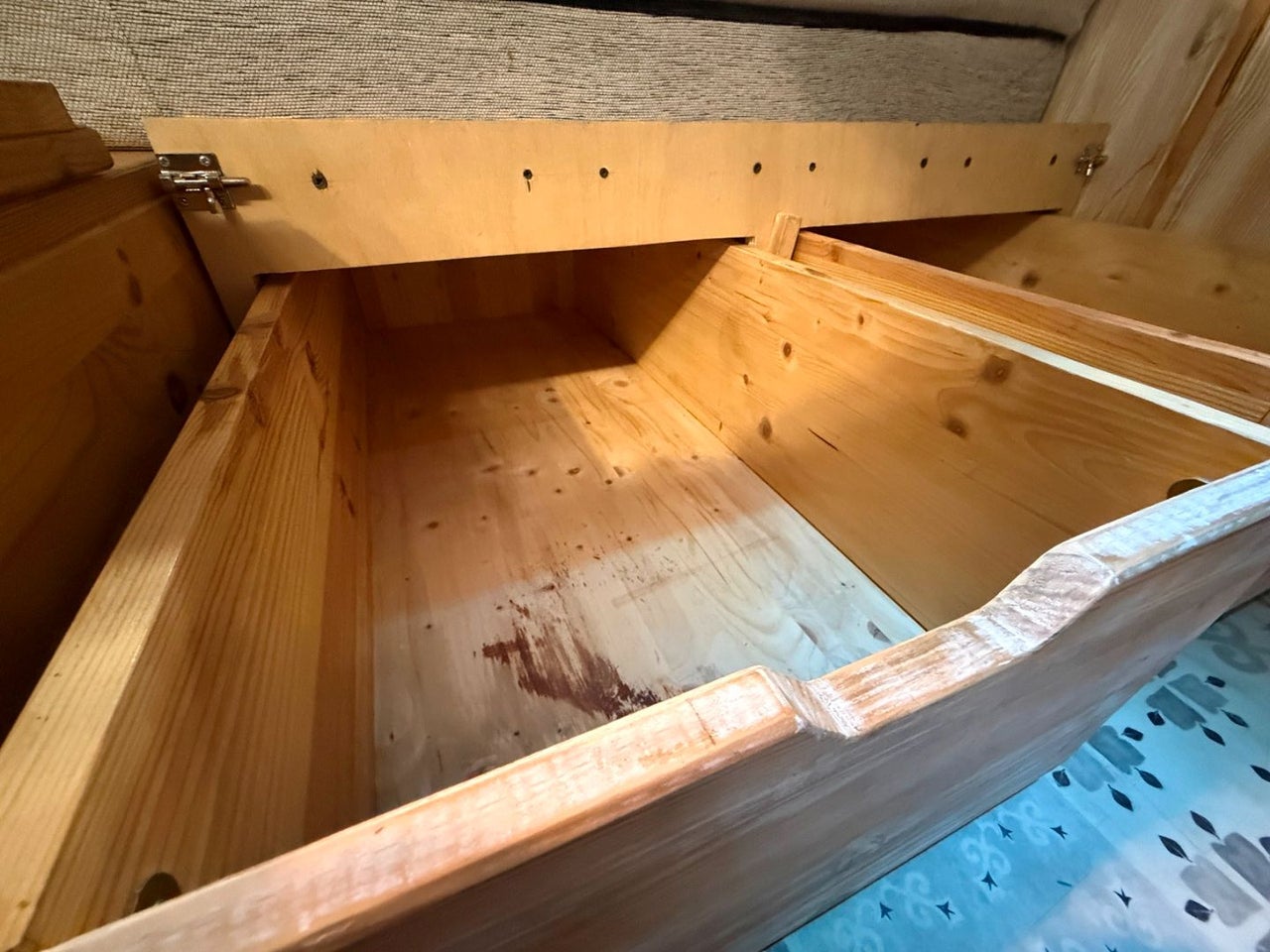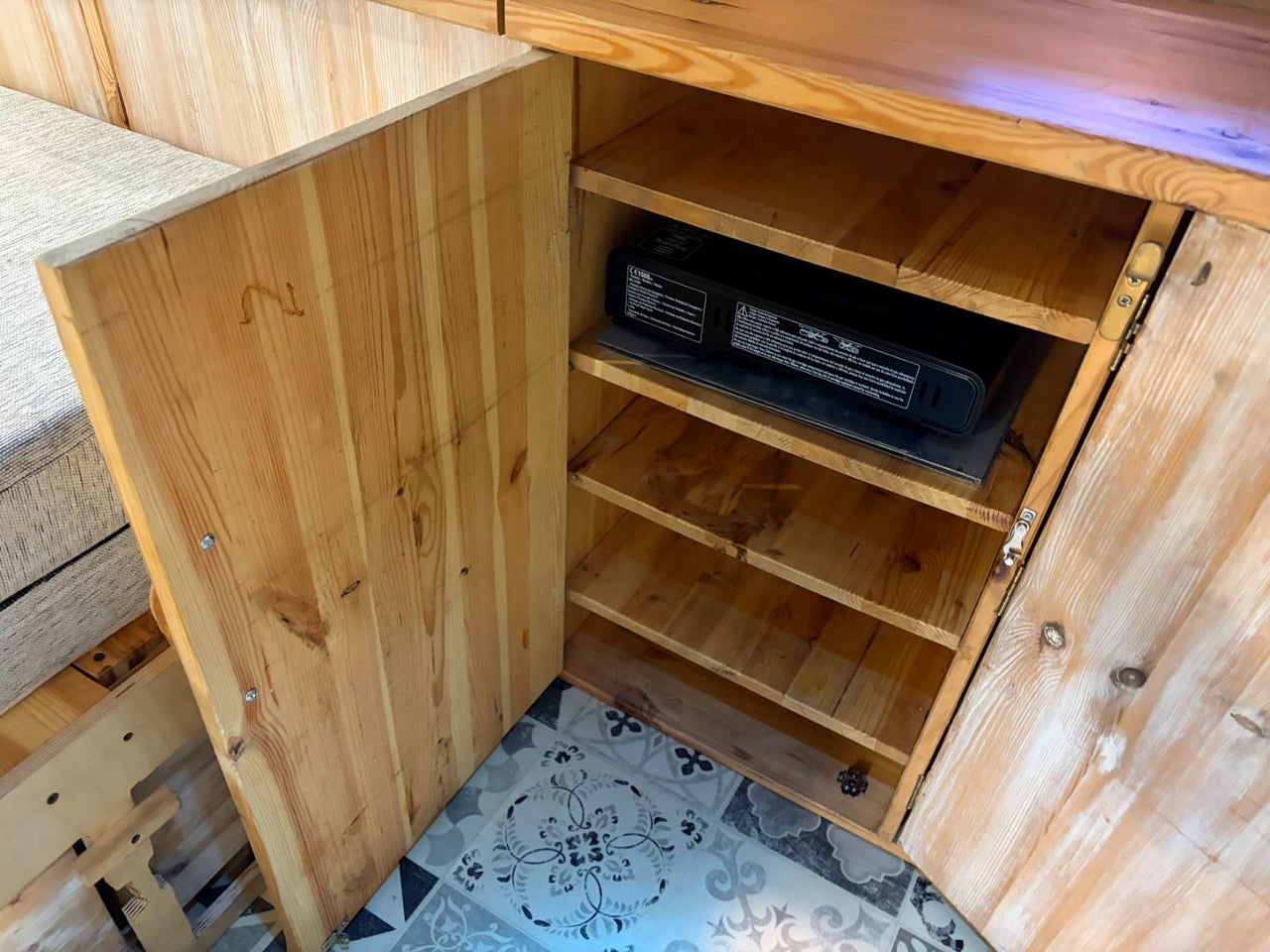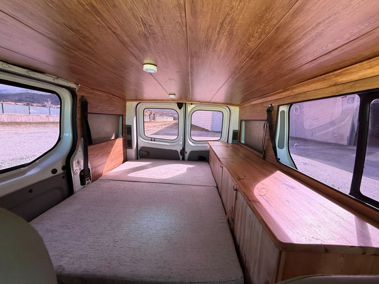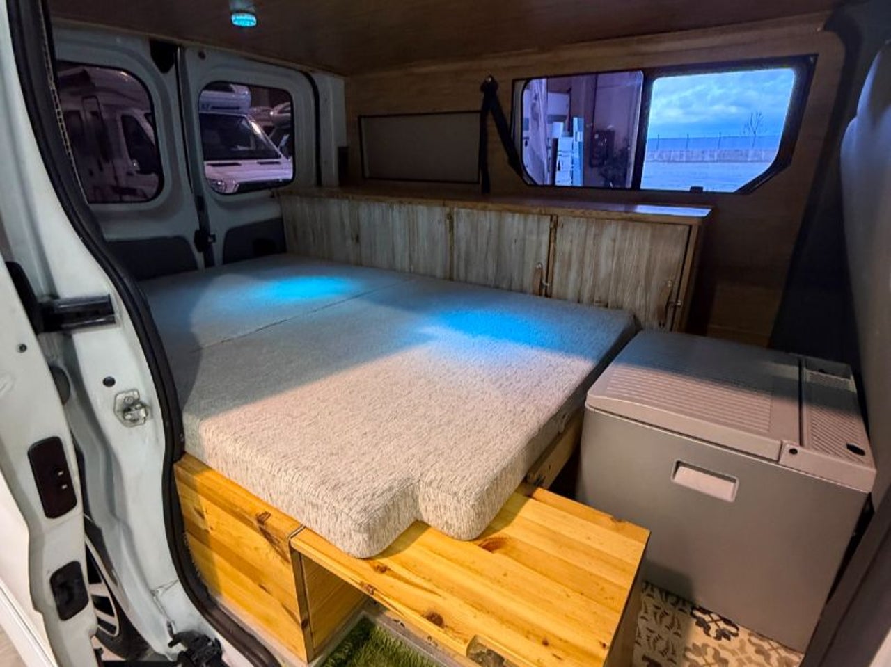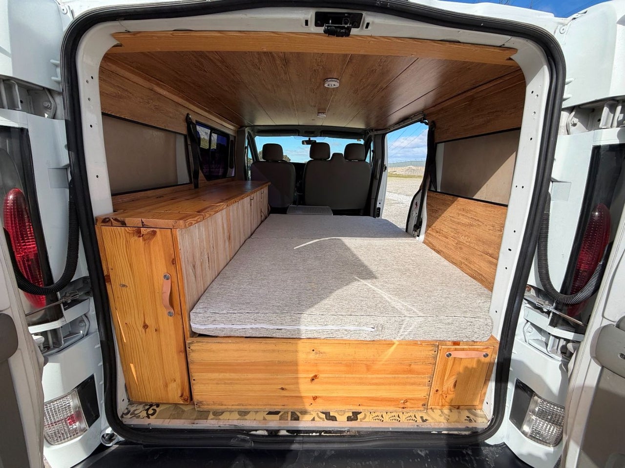CAMPERIZACION EXTRAIBLE. CONSISTENTE EN MOBILIARIO LATERAL IZQUIERO CON ARMARIOS Y ENCIMERA, CAMA DOBLE PLEGABLE, MESA PARA COMER, GRANDES CAJONES DE ALMACENAJE BAJO LA CAMA.